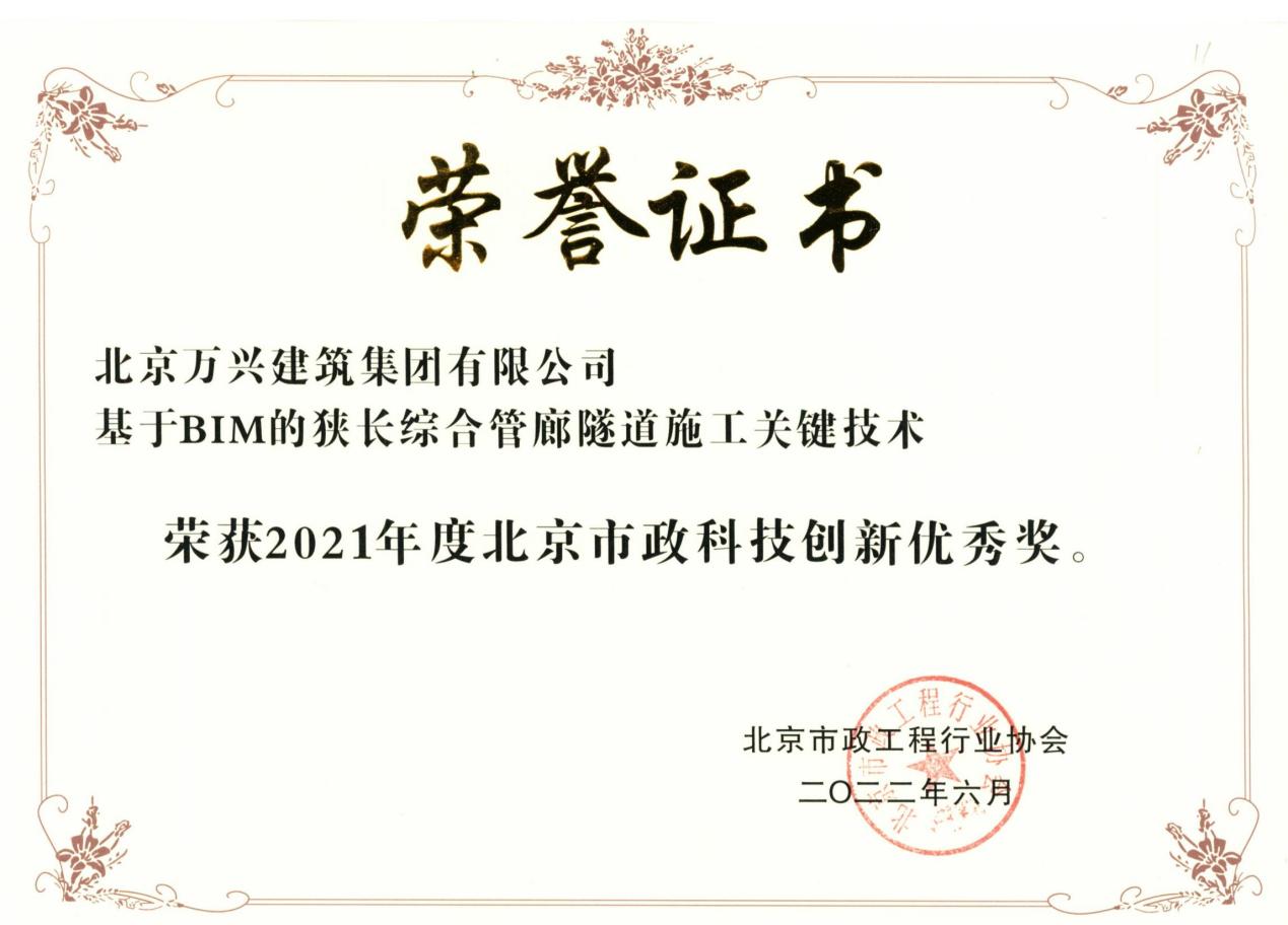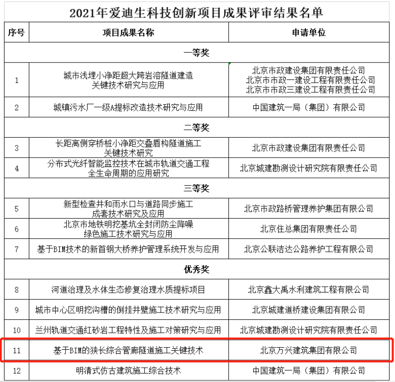 近日,北京市政工程行業協會對2021年度北京市政工程行業協會愛迪生科技創新獲獎項目成果及獲獎單位進行了表彰,萬興集團申報的《基于BIM的狹長綜合管廊隧道施工關鍵技術》榮獲2021年度北京市政協會愛迪生科技創新優秀獎。