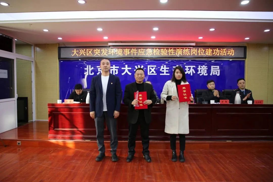 活動最后,區生態環境局黨組成員、副局長郭建強為萬興集團頒發2023年北京市大興區突發環境事件檢驗性演練崗位建功優秀組織獎,萬興集團副總經理羅高揚作為集團代表接受榮譽獎杯。