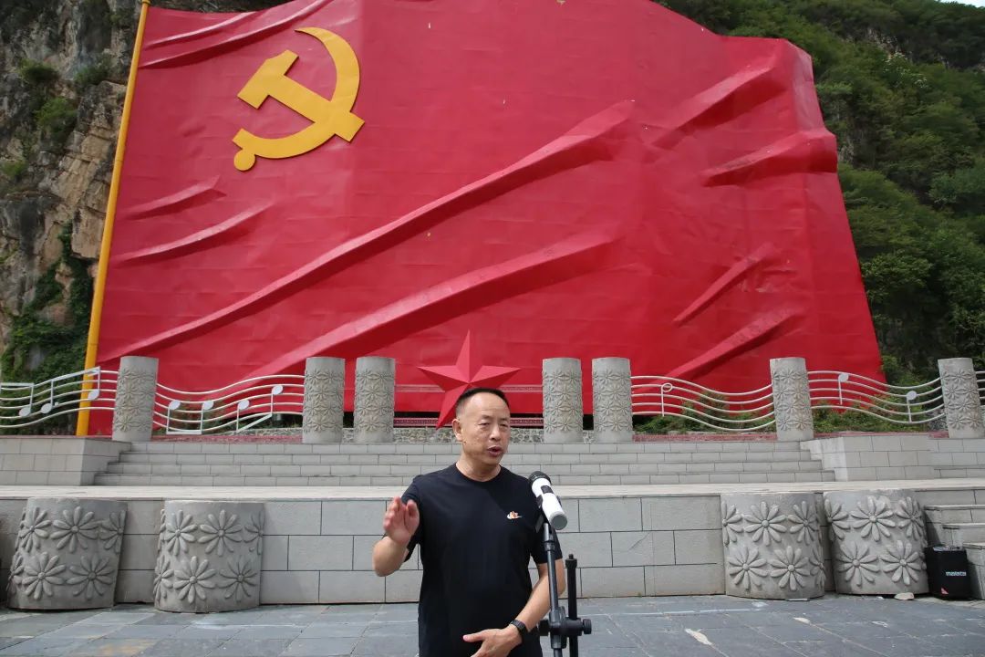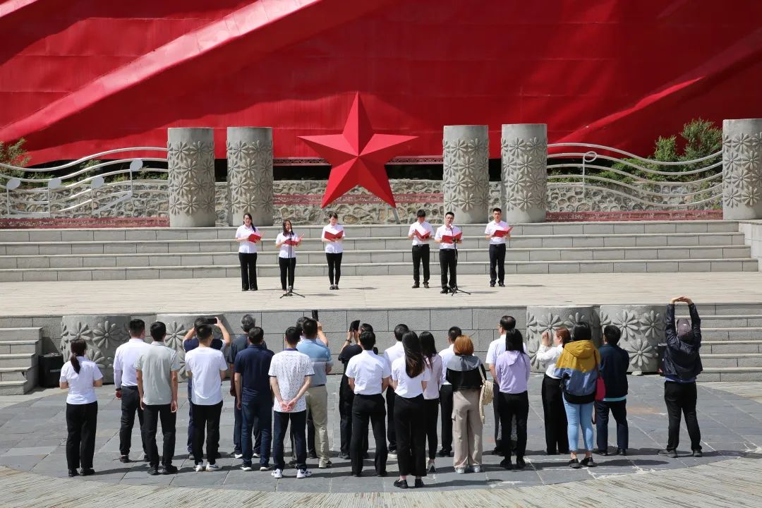 在巨幅黨旗前,全體黨員干部齊聲高唱《沒有共產(chǎn)黨就沒有新中國》。