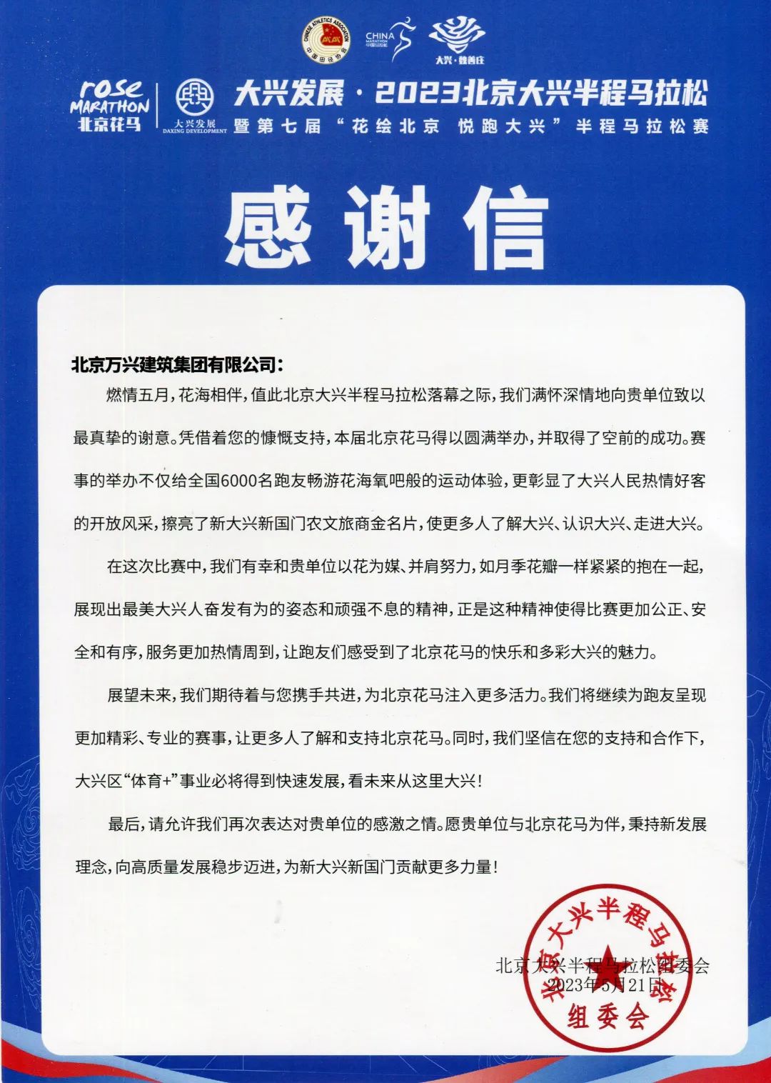 近日,適逢中國共產黨建黨102年之際,萬興集團收到北京大興半程馬拉松組委會的“情系花馬 慷慨支持”的錦旗和感謝信,感謝萬興集團對花馬賽事的慷慨支持。