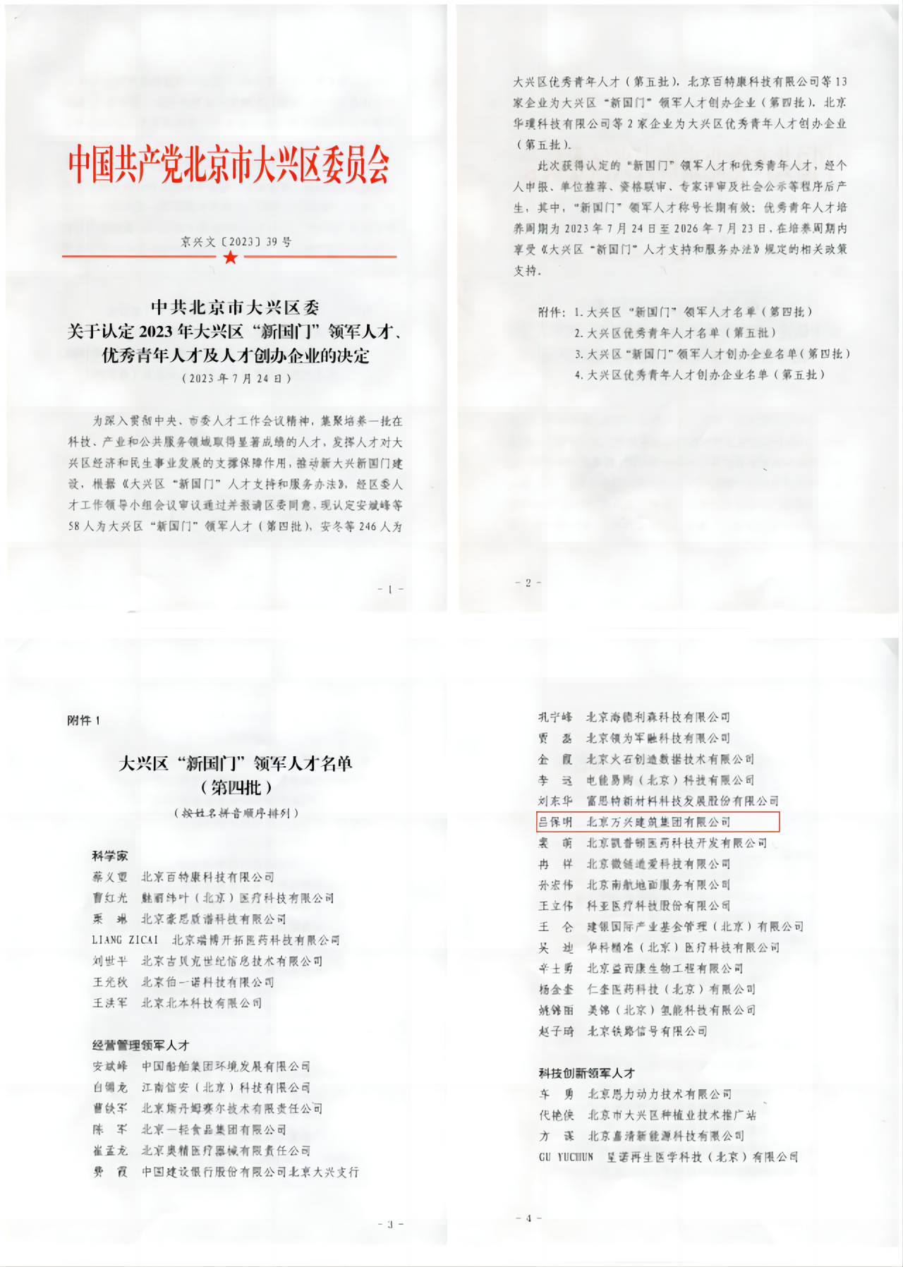 【概要描述】近日,大興區(qū)委下發(fā)了《中共北京市大興區(qū)委關(guān)于認(rèn)定2023年大興區(qū)“新國門”領(lǐng)軍人才、優(yōu)秀青年人才及人才創(chuàng)辦企業(yè)的決定》,北京萬興建筑集團(tuán)黨委書記、董事長呂保明榮獲2023年度大興區(qū)“新國門”領(lǐng)軍人才--經(jīng)營管理領(lǐng)軍人才稱號。