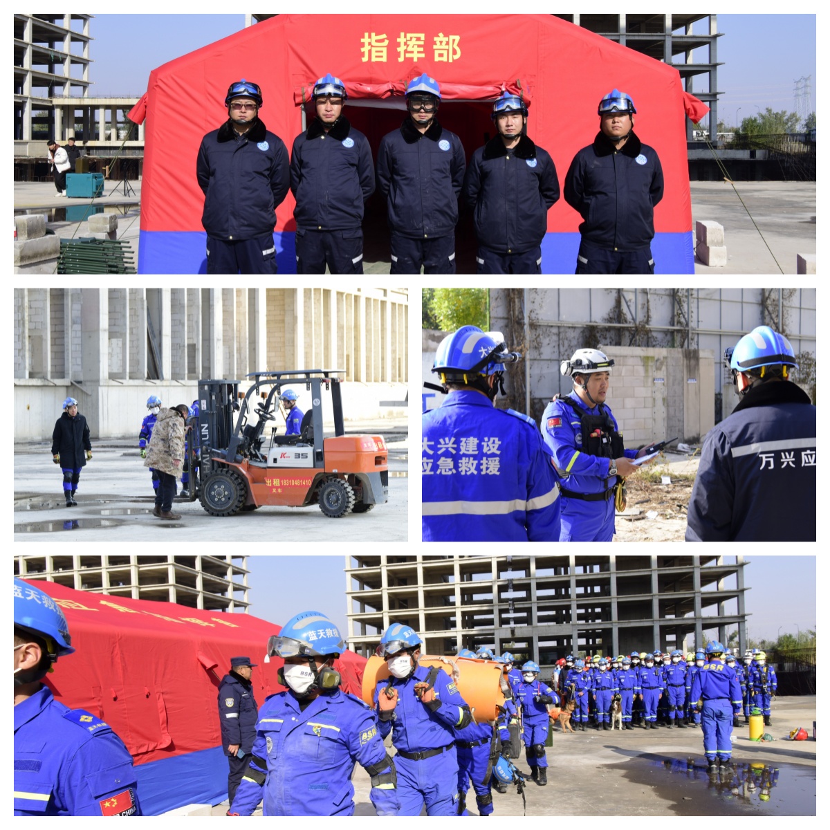 北京萬興應急救援隊接大興區應急局的通知,積極響應,調派隊員、機械設備,協助場地布置并全程參加演練。